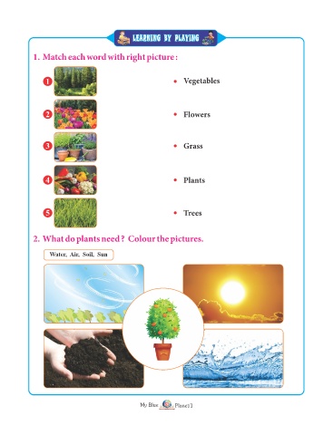 L L LEARNING BY PLAYINGEARNING BY PLAYINGEARNING BY PLAYING 1. Match each word with right picture : 1 Vegetables 2 Flowers 3 Grass 4 Plants 5 Trees 2. What do plants need ? Colour the pictures. Water, Air, Soil, Sun 53 53 My Blue 53 Planet/1